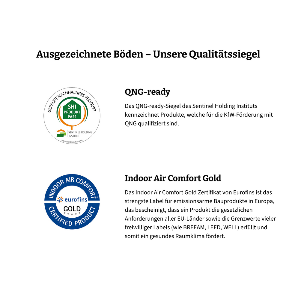 Auch ökologisch triffst du mit diesem Boden eine gesunde Entscheidung: 100% Virgin-Vinyl, garantiert phtalatfreie Trägerplatte ohne schädliche Weichmacher, besonders emissionsarm (beste Schadstoffklasse für Bodenbeläge bestätigt vom TÜV Rheinland) und 100% recyclebar. Das sind unser Versprechen, auf die du dich verlassen kannst.
