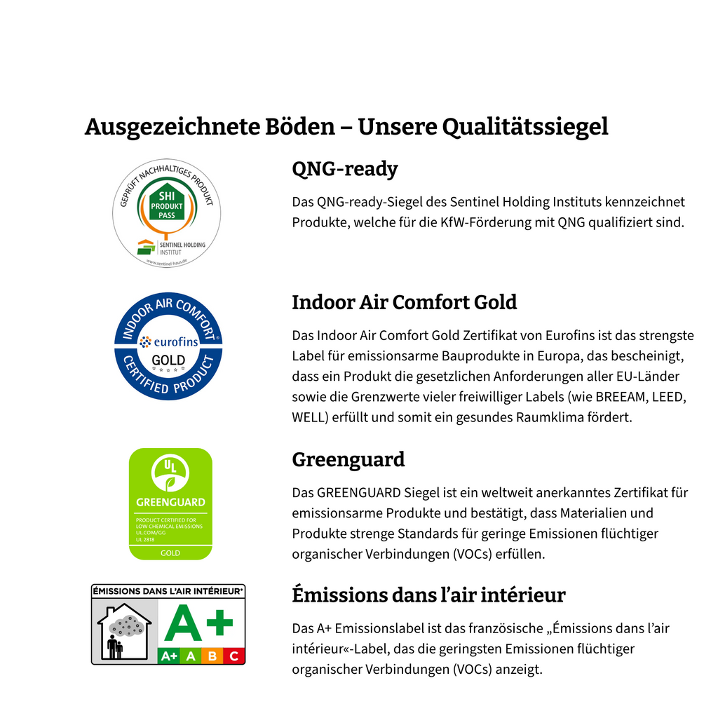 Durch den soliden Aufbau und die robuste Nutzschicht ist dein Boden zudem besonders strapazierfähig und auch für intensive Beanspruchung im privaten Bereich geeignet. Auch in Sachen Gesundheit und Sicherheit triffst du mit diesem Boden eine gute Entscheidung: Garantiert phtalatfreie Trägerplatte ohne gesundheitsbedenkliche Weichmacher, nachhaltig dank langer Lebensdauer und schwer entflammbar (Brandschutzklasse Bfl-S1). Das sind unsere Versprechen, auf die du dich voll und ganz verlassen kannst!