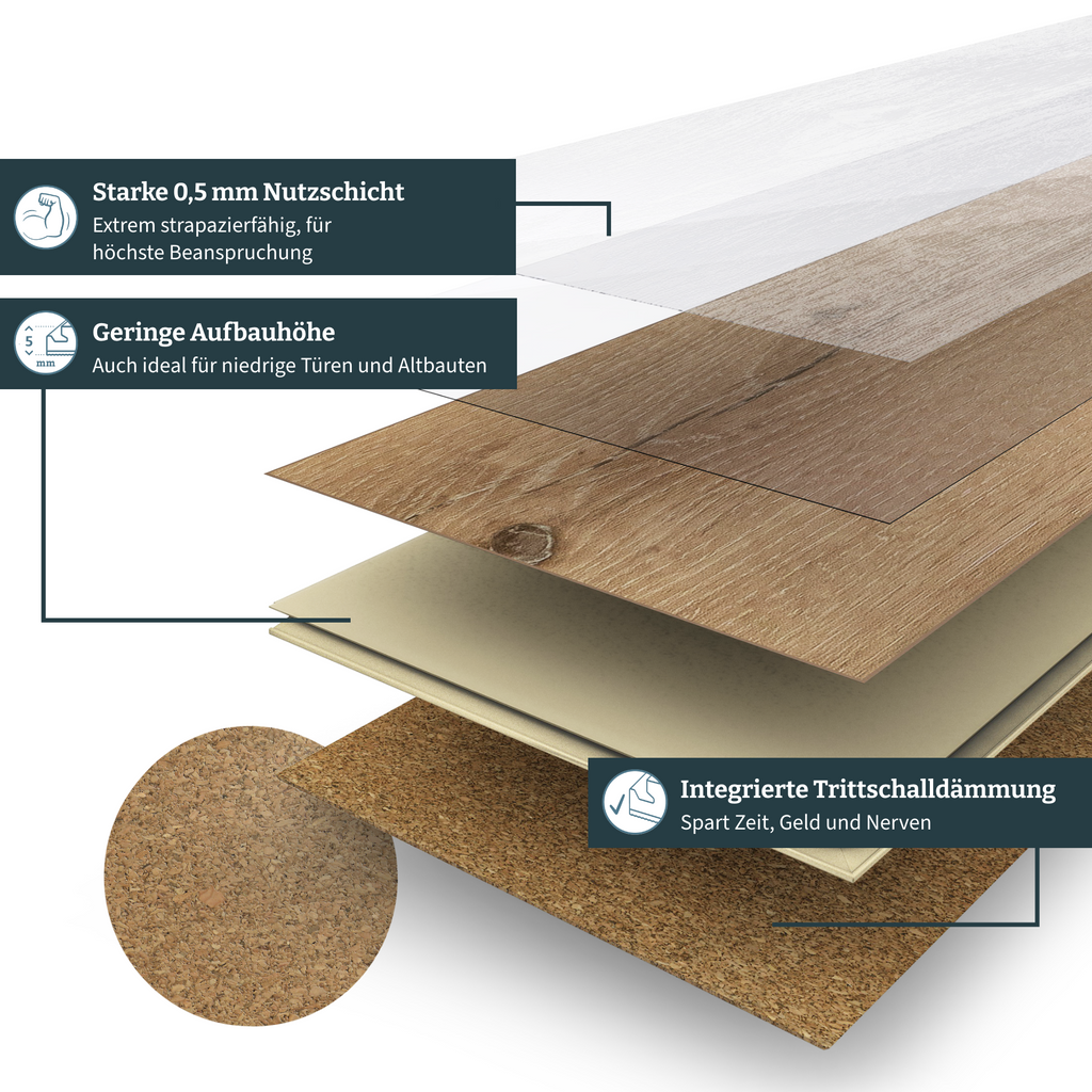 Doch dieser Luxus-Boden hat noch viel mehr zu bieten: Er vereint Nachhaltigkeit und ökologisches Bewusstsein mit Komfort und behaglichen Ambiente. Auch das Thema integrierte Trittschalldämmung wurde hier nachhaltig zu Ende gedacht. Die Schicht aus echtem Natur-Kork sorgt nicht nur für einen ausgezeichneten leisen Raumklang, sondern spart dir auch beim Verlegen einen extra Arbeitsschritt, Zeit, Geld und Nerven.
