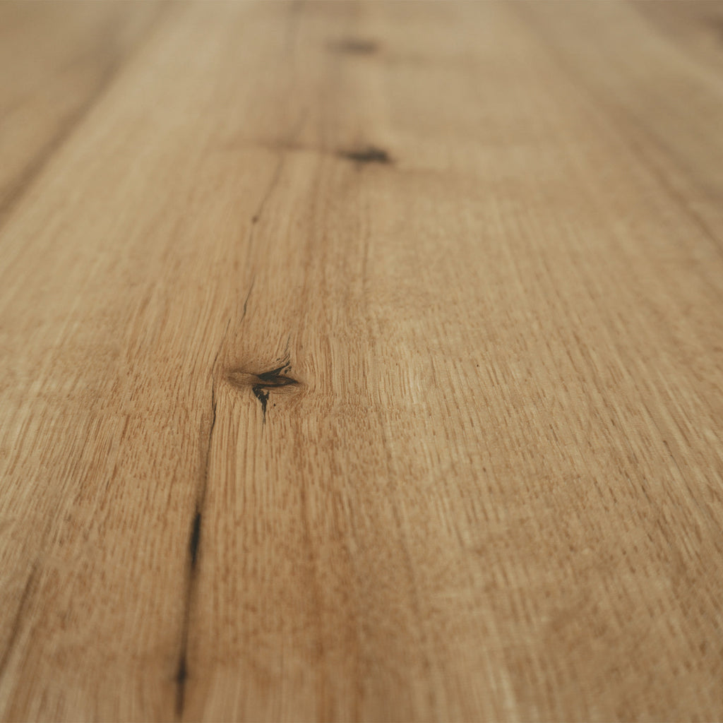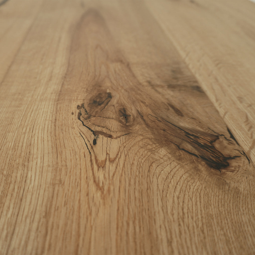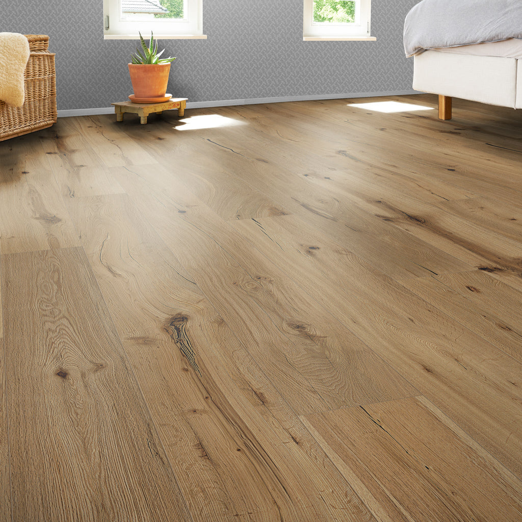 Mit der rustikalen Sortierung und gebürsteten Oberfläche wird die natürliche Maserung des Holzes auf einzigartige Weise betont. Die spezielle Oberflächenbehandlung mit Natur-Öl bewahrt die matte Optik und sorgt gleichzeitig für eine einfache Pflege.